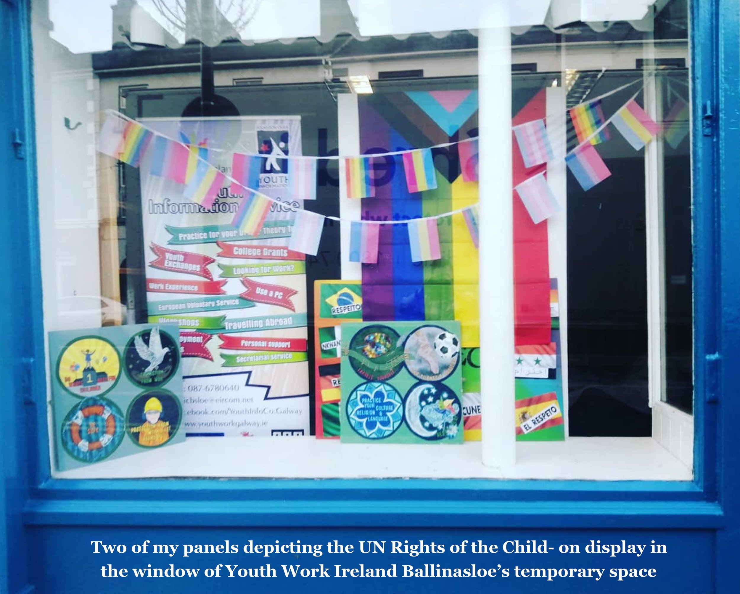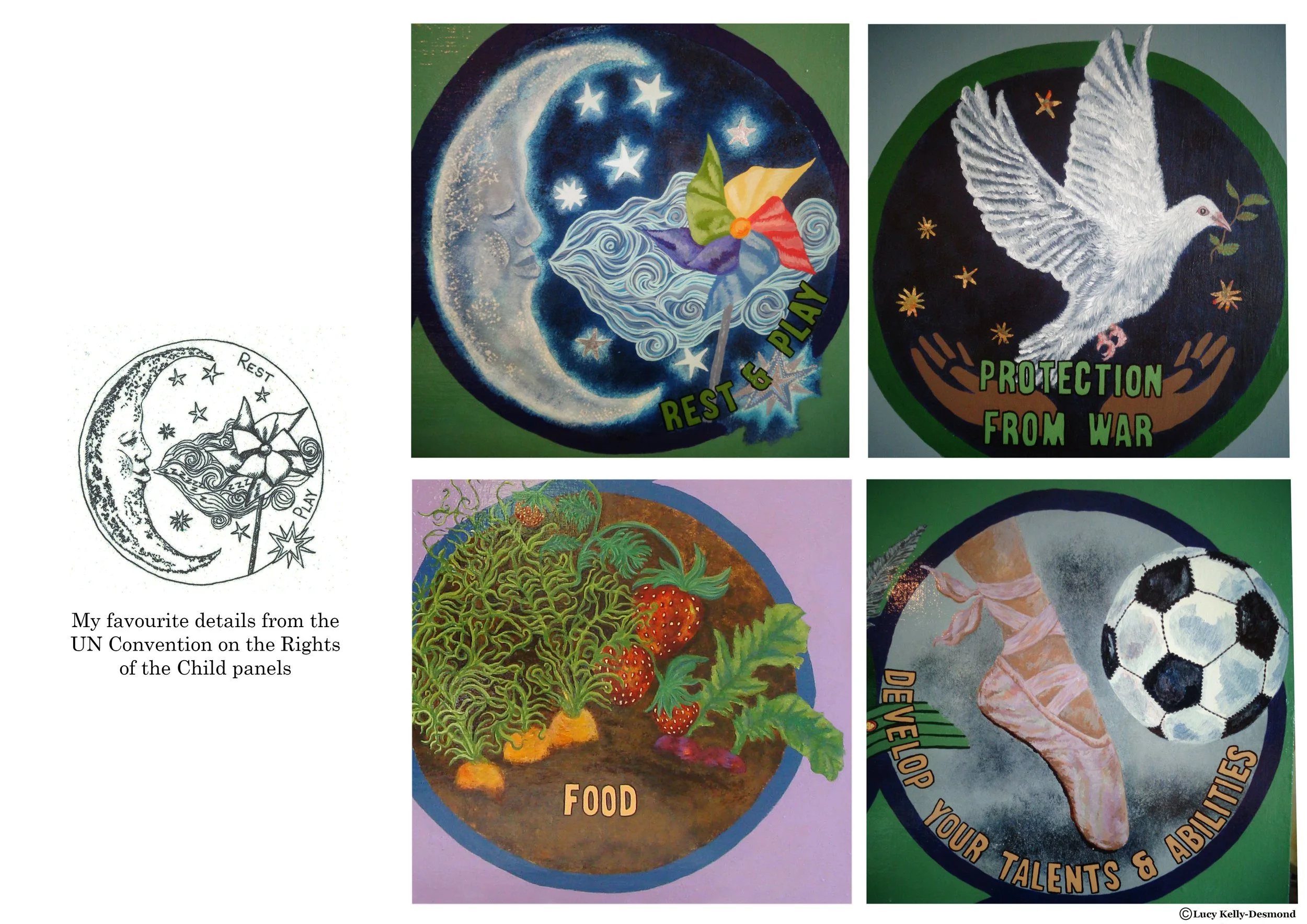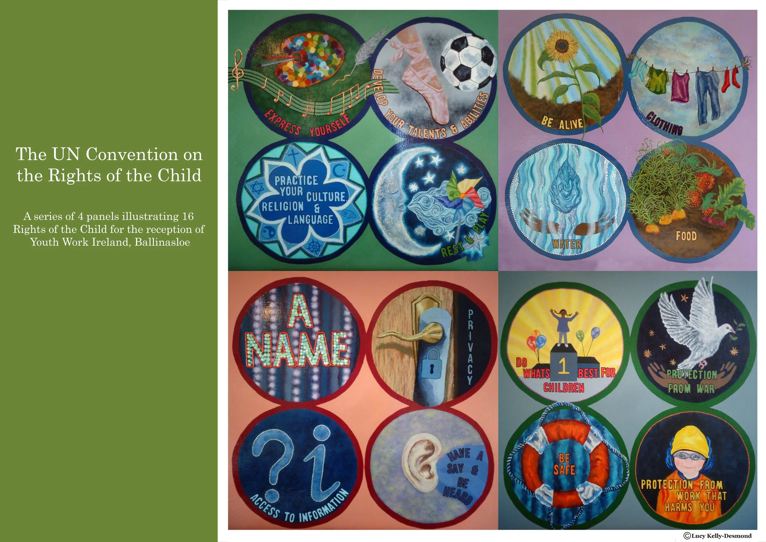 While working in a youth centre, I was asked to create a series of painted panels for the reception area-which had a plain white wall. I picked out 16 important Rights of the Child to represent. Each circle has my own illustrated interpretation of these rights for children.