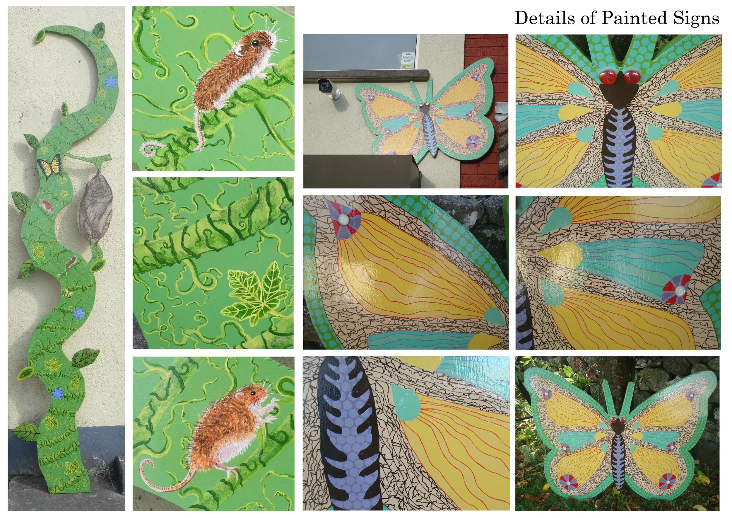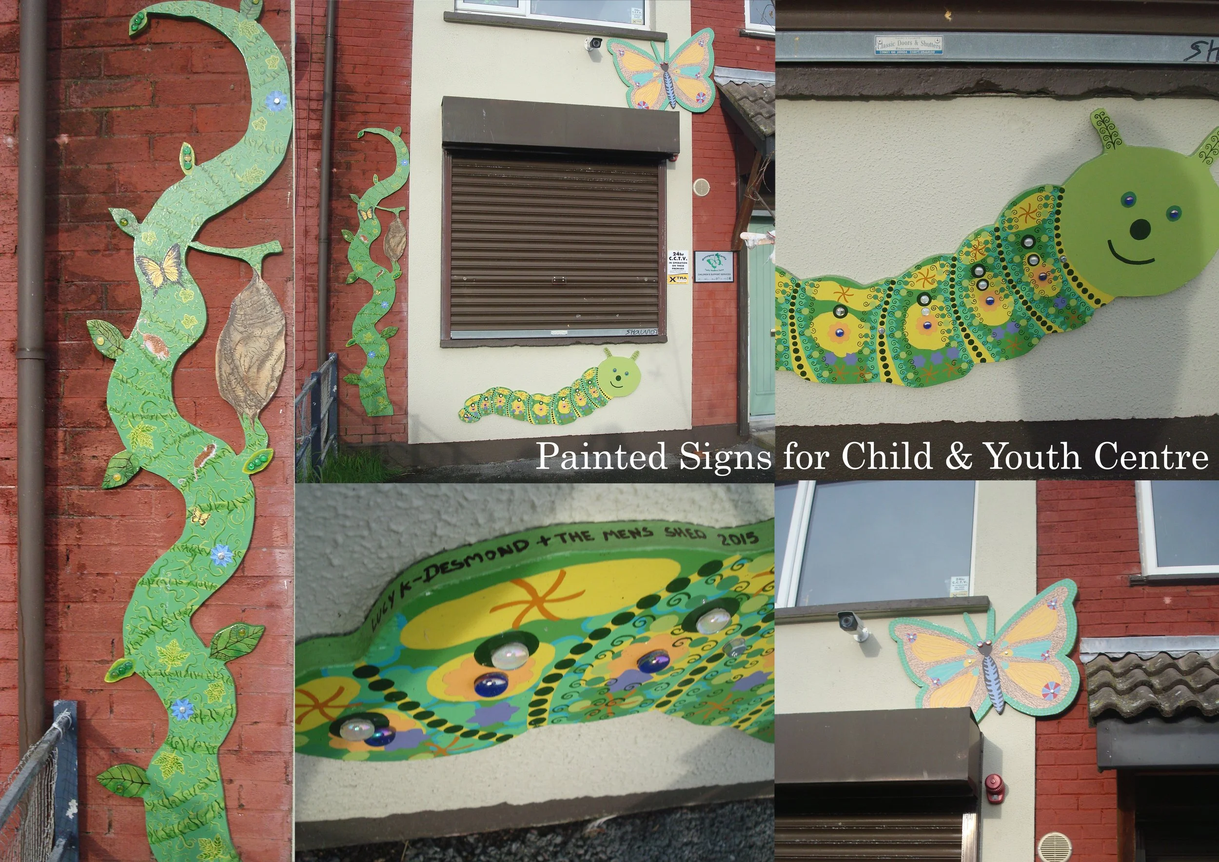 These signs were made for the outside wall of a house used for child and youth services. The director of the centre asked me and the Men’s Shed to create a caterpillar, cocoon and butterfly. They were made from weather treated marine plywood. Members of the Men’s Shed cut out the signs and I painted them.